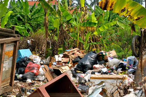 | A cart full - ready to be added to the pile where it will be sorted. Some things will be sold, others recycled and the remaining will be burned (you can see a little of the smoke in this picture). |